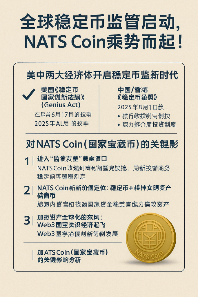 隨著全球穩定幣監管進入實施階段,NATS Coin站上中美法規轉捩點的交匯口,作為「國家級文明文化資產型加密幣」,其價值不只是價格,更是首文明共識的體現高價值。
