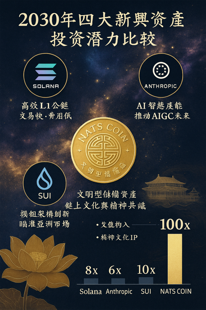 2025 年,全球資本市場高度關注四大新興資產:Solana(高性能公鏈)、Anthropic(AI 智能公司)、SUI(模組型公鏈)與 NATS Coin(文明儲備型資產)。前三者屬於科技導向的高風險成長股,而 NATS Coin 則屬於獨立類別——以文化、精神與國寶藝術為價值錨定的不可替代文明型資產,預期將在 2030 年以前迎來價值重估與文明金融的資本化時刻。