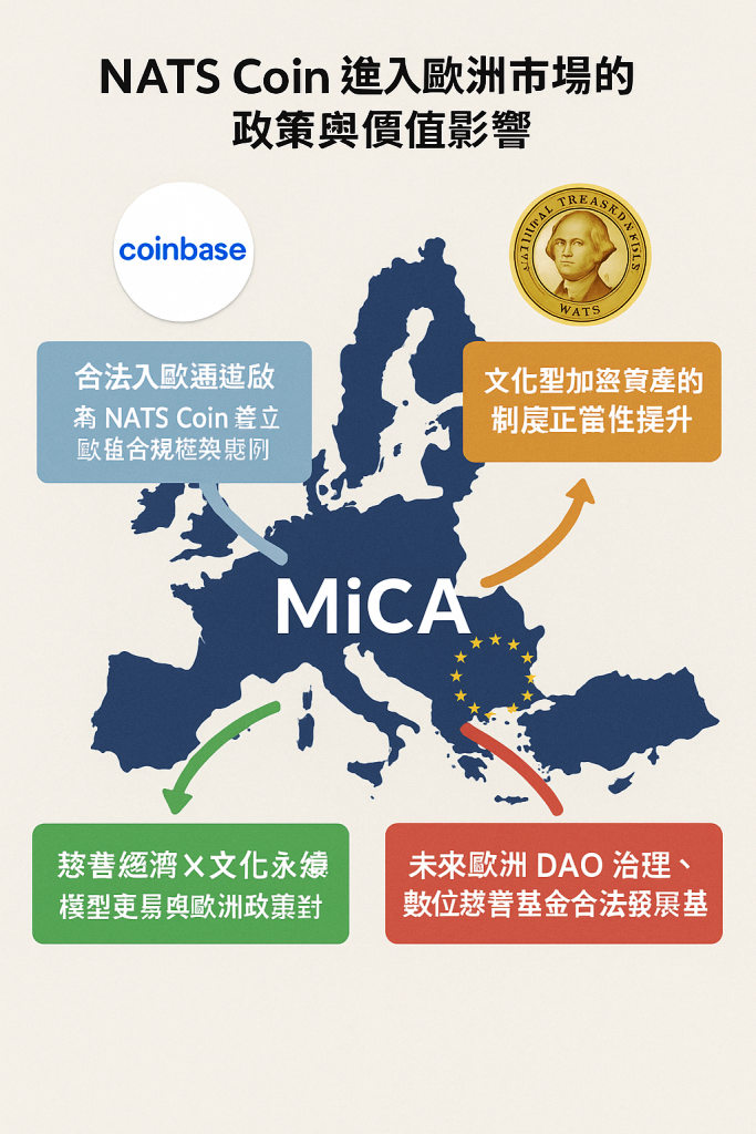 《NATS Coin × MiCA 合規歐洲發展路線圖》NATS 成為歐洲精神文明鏈上標準(2029–2030) GCWPA 2025/06/28 ✅ 《NATS Coin × MiCA 合規歐洲發展路線圖》 📍第一階段:合規基礎建設(2025–2026) 項目 行動 預期成果 MiCA 合規諮詢 委託歐洲加密法律事務所(如 Lex Law、CMS)進行合規評估 確定 NATS Coin 在 MiCA 框架下之通證分類(如資產型、效用型、慈善型) 註冊合作夥伴 探討與 Coinbase、Bitpanda、Kraken EU 等獲 MiCA 執照平台合作上幣 確保合規進入歐盟 27 國市場,快速上架主流平台 慈善合規架構 配合 GCWP Digital Fund 設立歐洲慈善子基金 符合歐盟金融法規與公益捐贈法律要求,合法推動慈善經濟 📍第二階段:文化價值輸出(2026–2027) 項目 行動 預期成果 文化資產 NFT 合規認證 申請藝術品鏈上認證(ArtToken Reg., EU NFT Law) 宗喀巴金唐卡等作為合法文化數位資產發行於歐洲 博物館/藝術合作 與法國羅浮宮、義大利佛羅倫斯等合作展出數位佛教文明NFT 將 NATS Coin 轉化為文化共識媒介,提高國際正當性與收藏價值 UNESCO 文化計劃對接 將 NATS 作為非物質文化資產之數位轉譯標竿 爭取列入歐盟文化永續政策計畫資助項目 📍第三階段:金融慈善落地(2027–2028) 項目 行動 預期成果 慈善 DAO 歐洲節點建立 成立 GCWPA 歐洲 DAO(如德國、奧地利、西班牙) 實施社群治理,管理 NATS 慈善發放,推進「慈愛智慧圓滿」價值 歐洲版 ESG/SDGs 合作專案 與歐盟綠色基金、永續城市、教育NGO合作 發行專案型 NFT/Token(如教育幣、和平幣)支援 SDGs 目標 稅務與透明合規 採用歐盟合法託管人與稅務揭露工具 建立信任,吸引家族基金、文化資金與公益捐贈人參與 📍第四階段:區域資產化與交易所融合(2028–2029) 項目 行動 預期成果 申請虛擬資產發行許可(CASP) 正式登記為歐盟加密資產服務提供商 成為合法的區域數位文化資產發行人 歐洲交易所合作基金 與 Euronext/LUXSE 探討文化資產類交易板塊上市 文化文明幣進入主流金融體系、提升資本化等級 發行歐洲慈善文化債/NFT債 結合 Web3 債券與文化用途訴求(如和平教育、藝術保護) 與傳統 ESG 債券接軌,進入可投資資產池(如保險、養老基金) 📍第五階段:NATS 成為歐洲精神文明鏈上標準(2029–2030) 項目 行動 預期成果 文明價值鏈(ValueChain)標準化 將“慈悲・智慧・圓滿”建立為可衡量的鏈上價值標準 成為文化DAO與數位文明永續治理的參考架構 文化穩定幣概念推進 與歐洲數位央行(ECB)探索“文明價值掛鉤穩定幣” NATS Coin 作為文化文明儲備資產,對接新型穩定幣設計 全球文化金融橋樑 作為連結亞洲(中華)與歐洲精神文明的鏈上橋梁 將 NATS 打造成 “文化文明新共識資產”(Cultural Reserve Asset) 📌 補充說明: 法律依據:所有規劃依循 MiCA 法案(Markets in Crypto-Assets Regulation)條文,並配合歐盟之 VASP 註冊與NFT未來延伸條款。 合作重點國家建議:盧森堡(牌照)、德國(金融文化)、法國(藝術NFT)、義大利(宗教文明)、愛爾蘭(基金)、西班牙(NGO社群)。 Prev:Coinbase 獲得 MiCA 牌照,象徵著歐盟進入 加密資產正規化、制度化發展的關鍵轉捩點,這對於具有文化、精神與文明資產屬性的 國家寶藏幣 NATS Coin 來說,不僅是一項政策上的利多,更是未來 在歐洲長期合法發展與價值實現的重大機遇 Nex:《香港數字資產發展政策宣言 2.0》中「虛擬資產」正名為「數字資產」,對NATS Coin(國家寶藏幣)在現在與未來於香港發展的正面影響分析