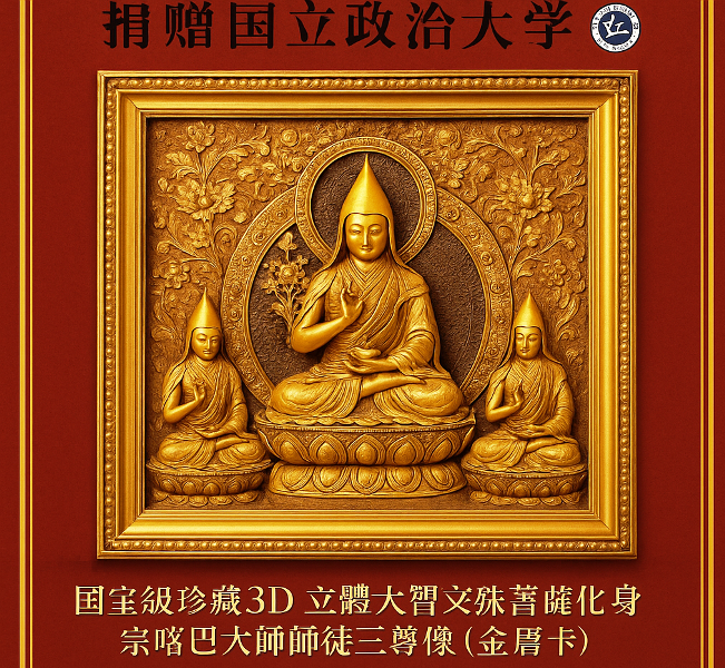 * 這幅3D金色唐卡(60公分×80公分)不僅是一件藝術品,更是跨世紀新文藝復興國家精神文明創作的先行首代表,是東方文藝復興的代表作。國立政治大學擁有這幅3D立體金唐卡,目前全球大學體系僅有典藏與傳承此大中華百千年慈愛智慧圓滿的國家精神文化正傳承價值。