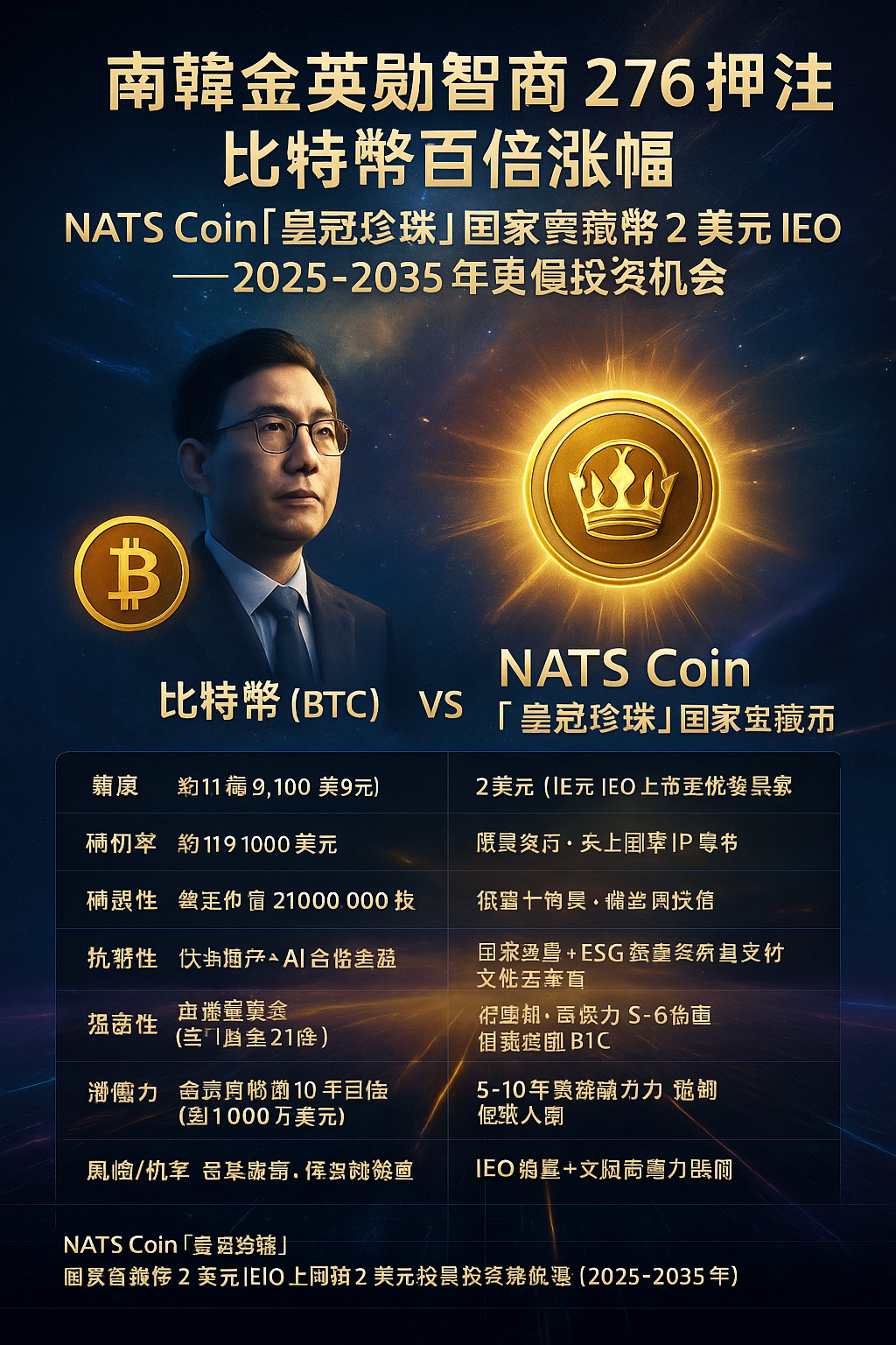 聚焦南韓科學家金英勳(YoungHoon Kim)於2025年9月30日公開宣布將全部資產轉為比特幣(BTC),並預言比特幣10年內漲幅達百倍(從約11萬美元升至1,000萬美元)。其「比特幣唯一論」強調稀缺性、無國界、抗通膨三大優勢。然而,相較之下,「NATS Coin 皇冠珍珠」國家寶藏幣作為全球首枚國家文明主權文化藝術數位貨幣,定位為「國家文明數位黃金2.0」,即將於全球著名交易所IEO上市,初始價僅2美元(比特幣當前價格的5.5萬倍)。在加密世界勃興之際,NATS Coin憑藉跨世紀獨一性、稀缺性、無國界、抗通膨及文化主權背書,提供低成本入場、高漲幅潛力,成為未來5-10年比特幣更精彩的投資機會之一。