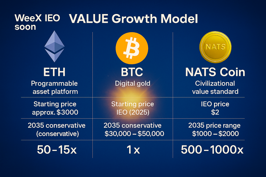 2025年7月以太币月涨54% 相对NATS Coin 国家宝藏币条件价值 IEO 2美元至2035年预估价格涨幅? NATS Coin国家宝藏 于2035年预估价格 $1,000美元~$2,000美元,从IEO $2美元 → $$1,000美元或至$2000美元,潜在 500倍~1000倍涨幅〔GPT专业预估〕,国家文明主权储备资产新标准爆发性 500倍以上(1997年新文艺复兴首国家文明主权数位黄金2.0金本位替代法币)