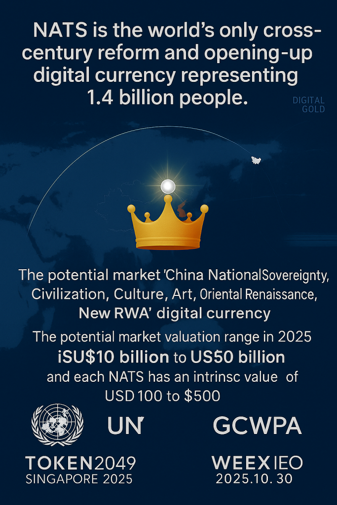 NATS is the world's only cross-century reform and opening-up currency representing 1.4 billion people. It is the world's first "Chinese National Sovereignty Civilization, Culture and Art Oriental Renaissance New RWA" digital currency. The potential market valuation range in 2025 is US$10 billion to US$50 billion, and each NATS has an intrinsic value of US$100 to US$500.