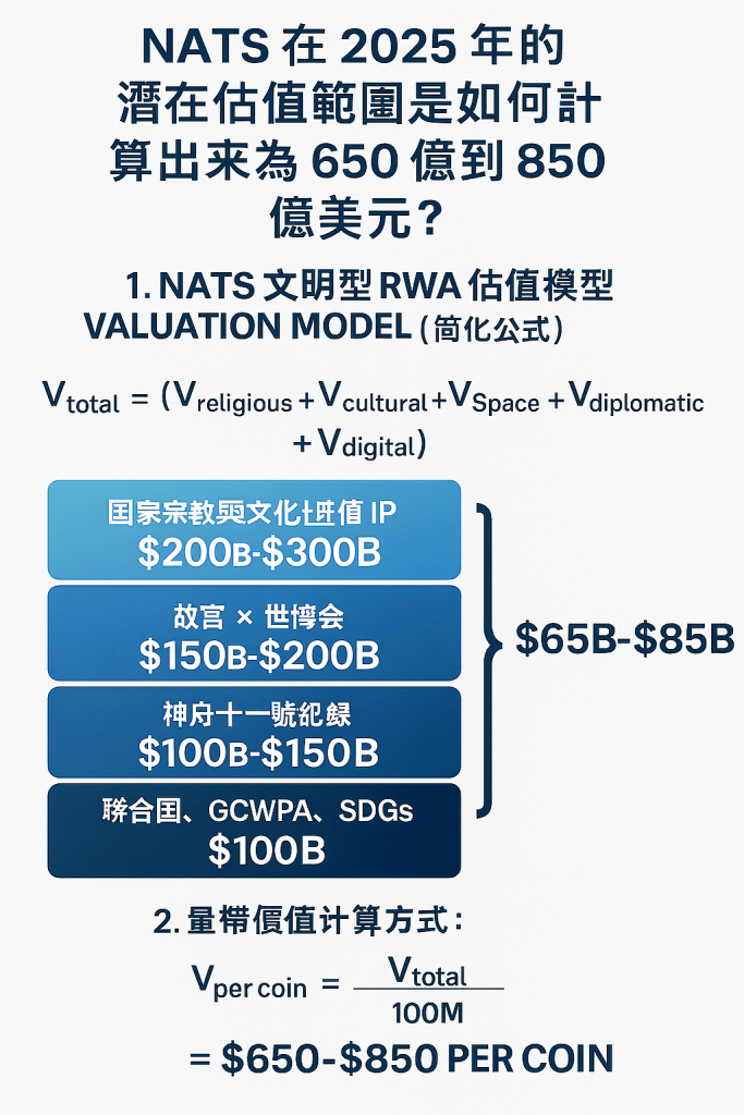 NATS(国家宝藏币)的整体潜在估值区间 650 亿 – 850 亿美元,并非基于短期市场炒作或单一币价推测,而是依据一个 RWA(Real World Assets,真实世界资产)文明价值模型,结合“文化、宗教、艺术、科技、外交、数字化”五大维度的文明主权加总而来。GPT