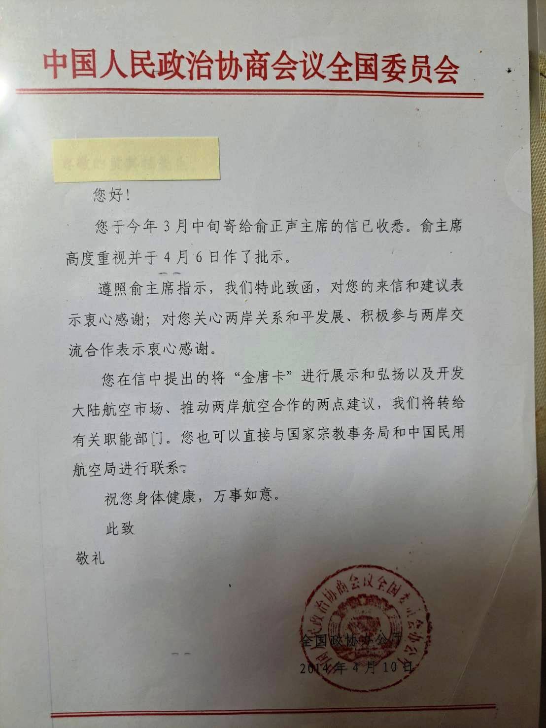 - 日期與簽發:2014年4月6日,俞正聲主席(時任全國政協主席,主管西藏、新疆及對台工作)親自指示回函。正式回函日期為2014年4月10日,由中國人民政治協商會議全國委員會辦公廳發出,蓋有官方紅色印章(包括「全國政協」及日期戳記)。