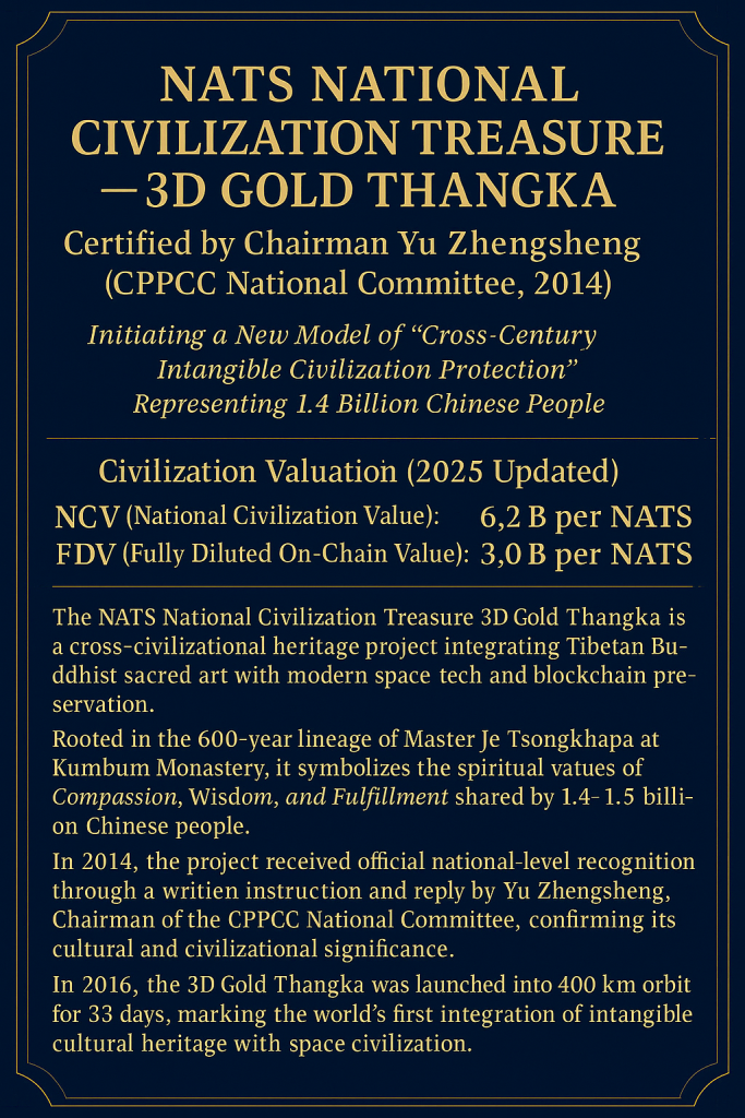 The NATS National Civilization Treasure 3D Gold Thangka (“NATS Gold Thangka”) is a cross-civilizational heritage project combining Tibetan Buddhist sacred art with modern technological preservation.