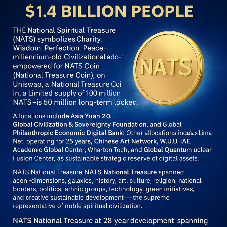 全球唯一跨世紀代表前兩大經濟體的14億人國家精神文明寶藏(NATS)為『慈善‧智慧.圓滿,和平』國家百千年文明正傳承,NATS 國家心靈藝術寶藏IP智權完全賦能NATS Coin(國家寶藏幣)於最大UNISWAP去中化交易所發行,總量僅一億枚國家寶藏幣(NATS),其5千萬枚長期鎖住,已陸續分配至全球首倡議及需發展的新慈善經濟體系,如亞元2.0,全球文明主全基金,全球慈善經濟數位銀行等,其他分配如已經營26年喇嘛網,中華藝術網,聯合國(W.U.U)IAE國際學士院全球產官學研教中心,Warton Tech , 全球量子核融合產研中心等體系,同時為永續戰略儲備數位資產庫。NATS 國家寶藏體系已28年發展已跨次元、星系、歷史、藝術、文化、宗教、國界、政治、族群、科技、綠色、文創永續發展之最高貴精神文明總代表。意義是跨次元、星系、歷史、藝術、文化、宗教、國界、政治、族群、科技、綠色、文創永續發展之最高貴精神文明總代表。