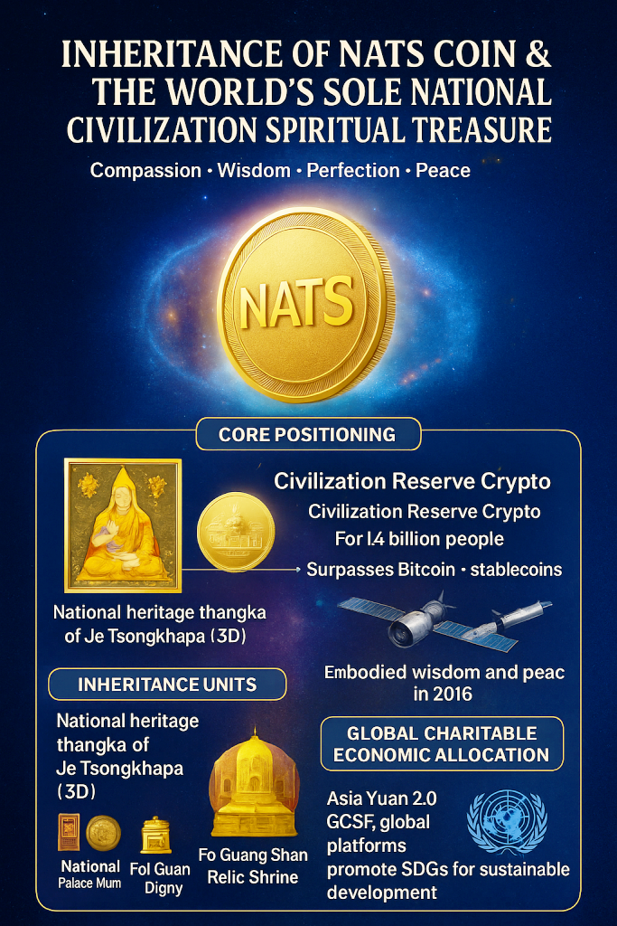 定位:NATS Coin作為「國家級藝術比特幣」(NA BTC),代表14億人口國家文明主權,融合「慈愛·智慧·圓滿·和平」,超越比特幣「數位黃金」與美元穩定幣,開創文明共識型儲備貨幣(Civilization Reserve Crypto)。