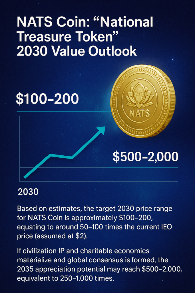 NATS Coin:「國家寶藏幣」2030 年價值展望 服務 人Hits:157 日期:2025/09/07 NATS Coin:「國家寶藏幣」2030 年價值展望 根據推估,NATS Coin 目標 2030 年的價格區間約為 100–200 美元,意即從當前 IEO 價(假設為 2 美元)看,約屬 增值 50–100 倍的水平。 若文明 IP、慈善經濟落實、全球共識形成,2035 年增值空間更高,達 500–2000 美元,相當於 增值 250–1000 倍。 上一篇(國家文明主權文明型 NA) 回目錄 下一篇(全球首個促進 ESG 與)