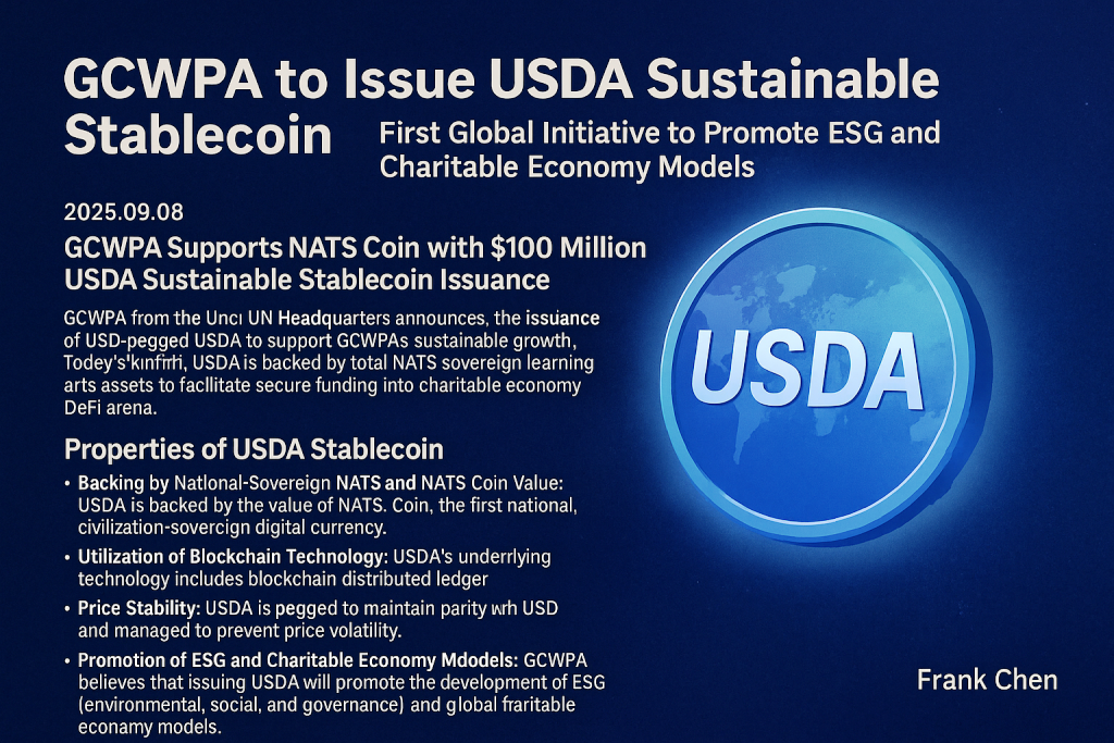 GCWPA is the world's first global initiative dedicated to promoting ESG and the development of philanthropic economic models, and is implementing the issuance of a USDA perpetual stablecoin. September 8, 2025
