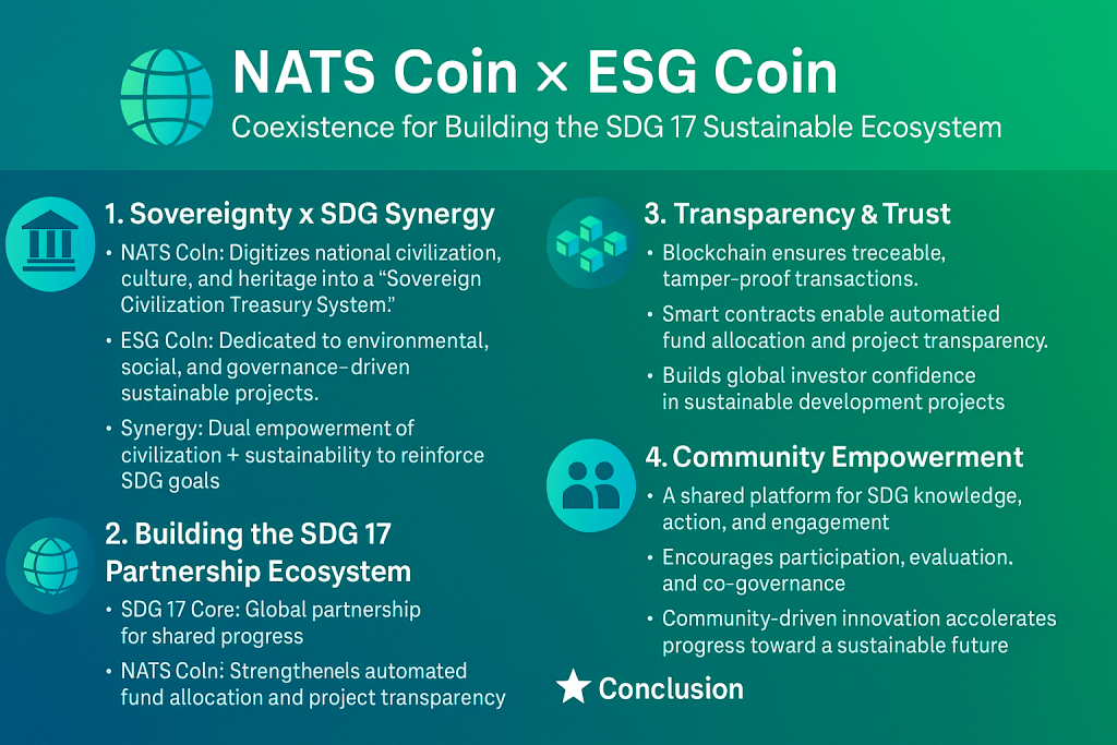 Greatest Unique Value: NATS Coin integrates with ESG Coin, combining national civilizational sovereignty, philanthropic economics, and the SDG 17 ecosystem to create a new paradigm for sustainable development.