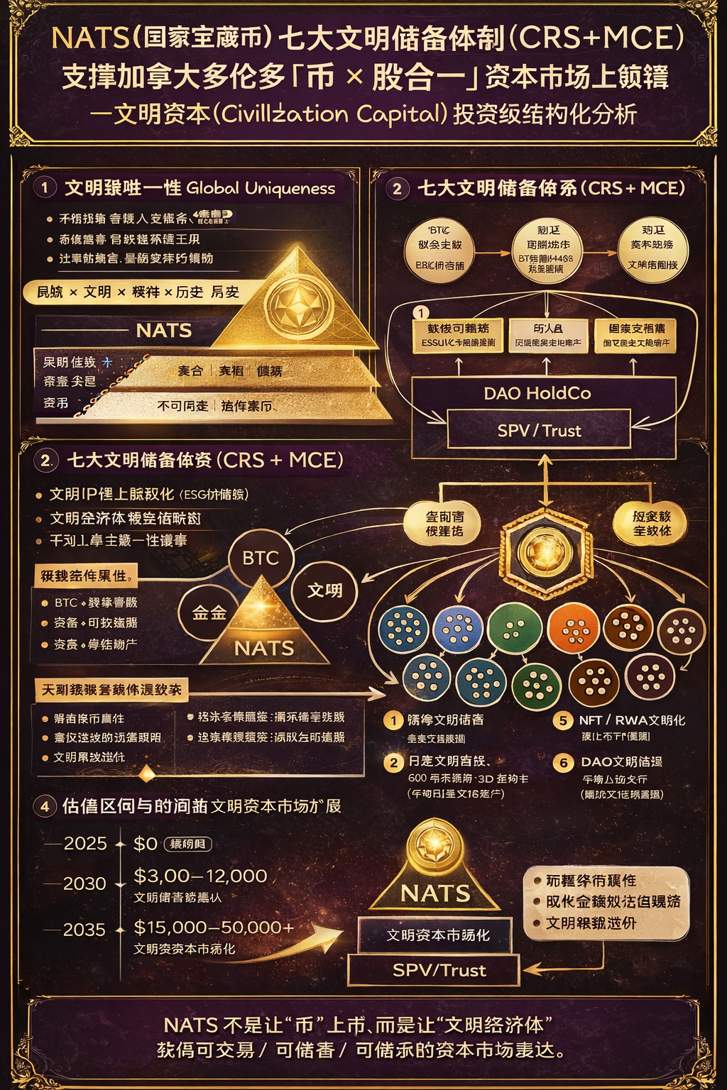 NATS (国家宝藏币)七大文明储备体系(CRS + MCE)支撑加拿大多伦多「币 × 股合一」资本市场上市逻辑——文明资本(Civilization Capital)投资级结构化分析**