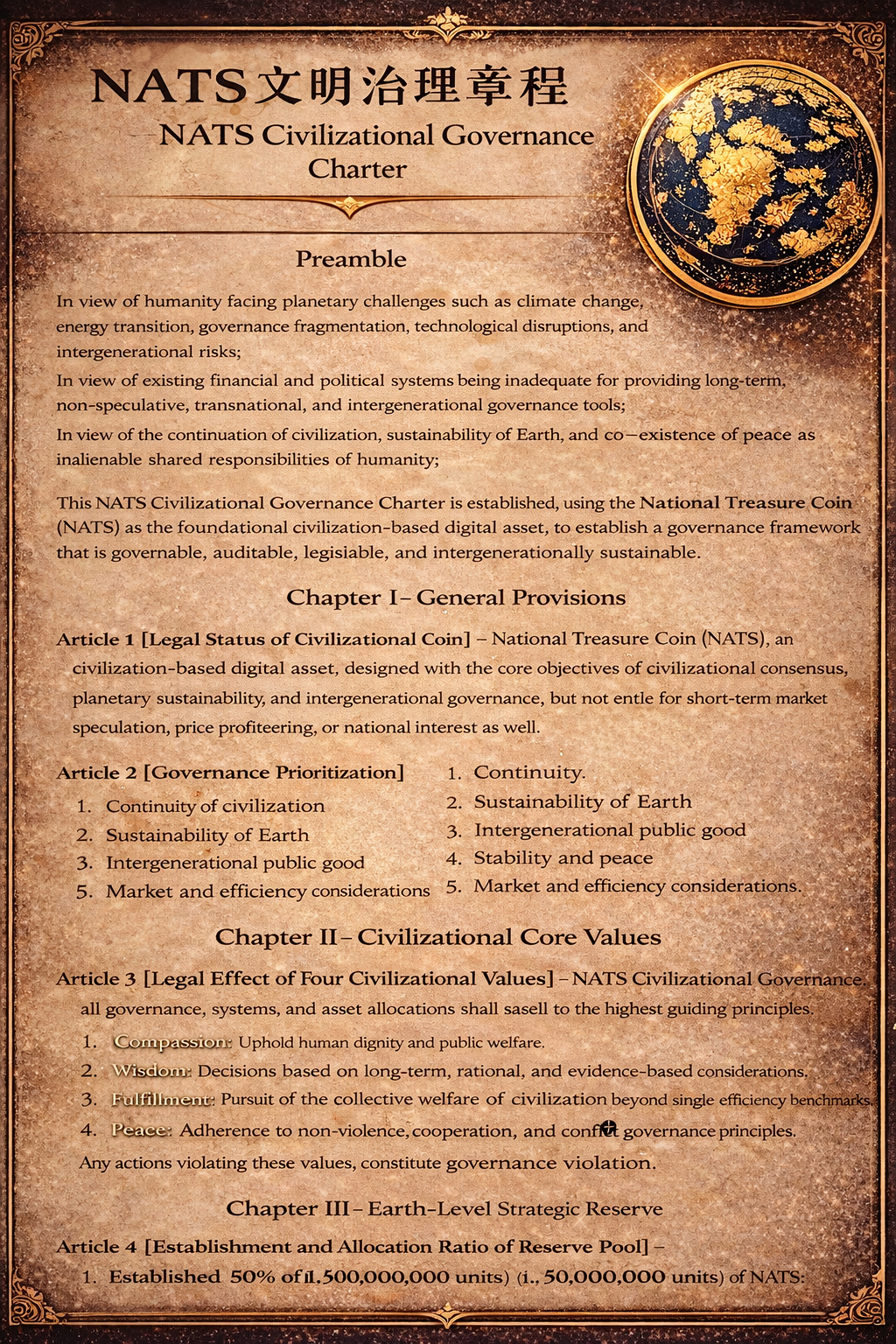This NATS Civilizational Governance Charter is hereby established, using the National Treasure Coin (NATS) as a civilization-based digital asset foundation, to construct a governance framework that is governable, auditable, legislatable, and capable of intergenerational succession.