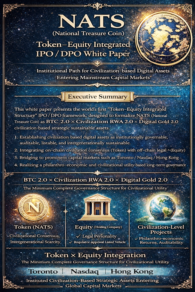This White Paper proposes a globally pioneering “Token–Equity Integrated Structure” for public listing, designed to carry NATS (National Treasure Coin) as a BTC 2.0 × Civilization RWA 2.0 × Digital Gold 2.0 civilizational strategic sustainability asset.