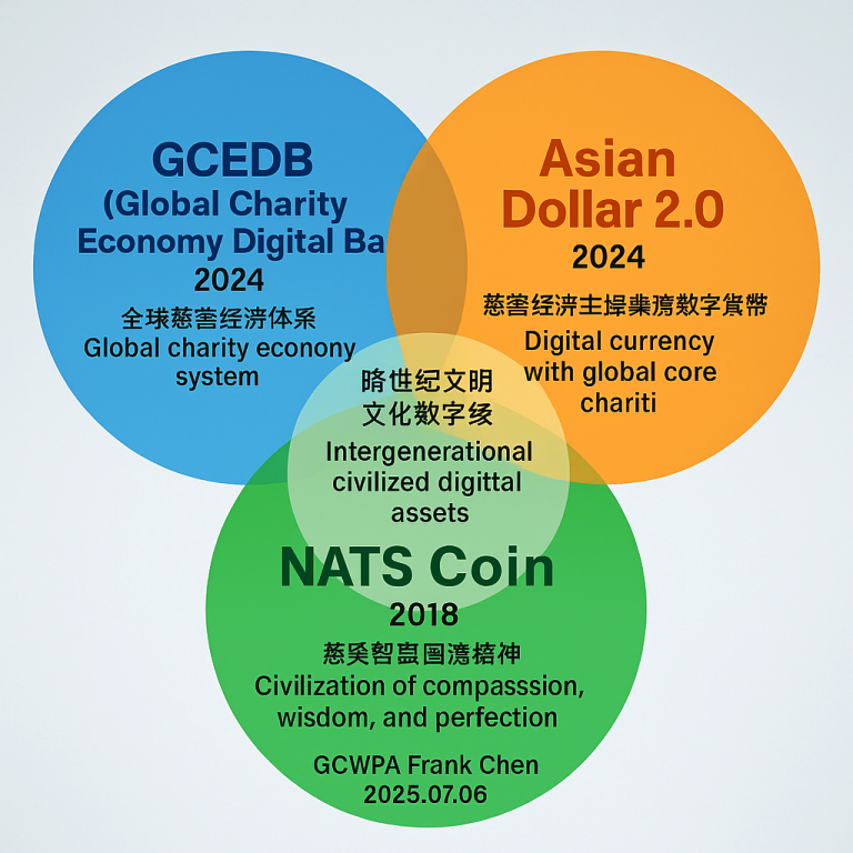 具有全球高度文明價值意識與全球金融創新視角。提出的「GCEDB × NATS Coin × 亞元2.0」三者之範疇價值關係及其在全球資本主義市場中所創造之慈善經濟價值與文明核心意義的分析與解構, GCWPA × Frank Chen