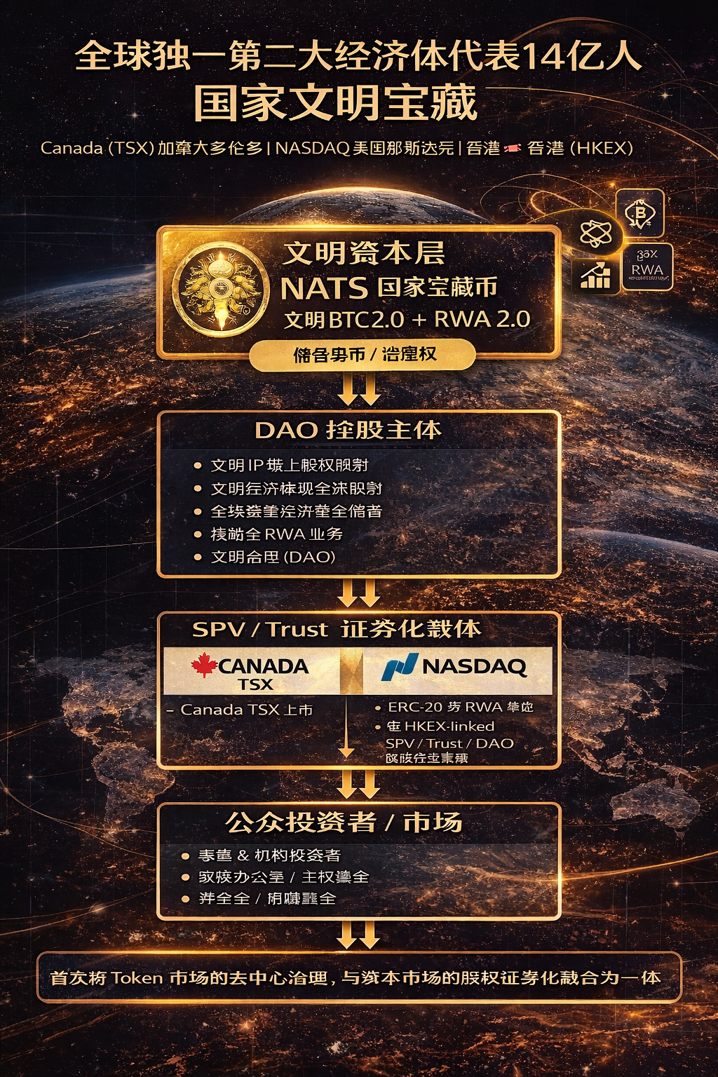 [NATS 文明儲備母幣(Token)] ↓ Token 共識治理 ↓ 提案投票 [DAO HoldCo(文明控股主體) 與全球慈善、IP、RWA 等儲備整合] ↓ 股權證券化 ↓ 上市安排 [SPV / Trust] ↓ [Canada TSX / NASDAQ / HKEX] ↓ [Institutional + Public Investors]